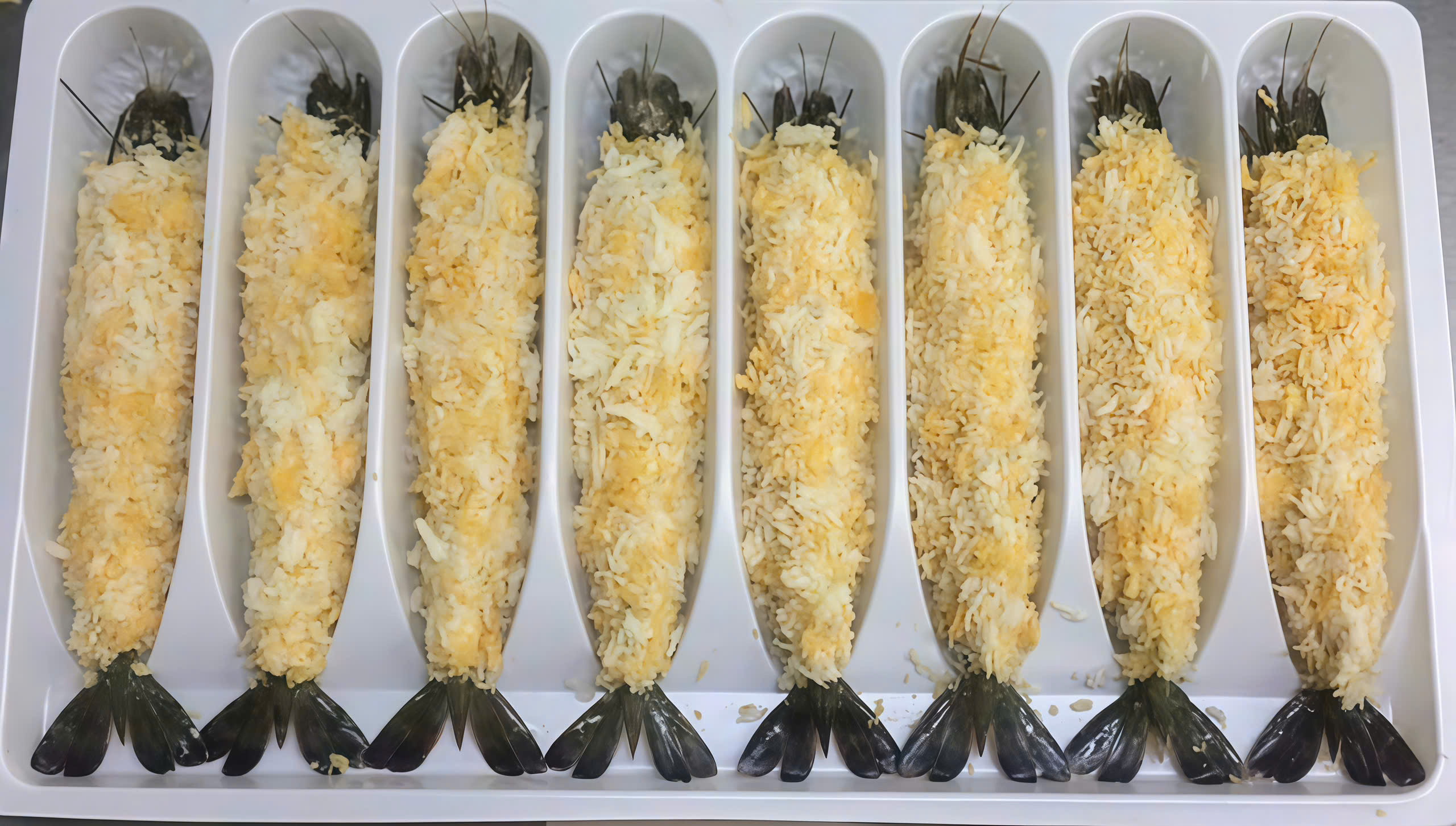 Điểm đặc biệt của Tôm thẻ tẩm bột nằm ở lớp vỏ bột vàng óng, được pha trộn theo công thức độc quyền. Từng con tôm được phủ đều lớp bột chiên xù hoặc bột tempura – hai loại bột nổi tiếng trong ẩm thực Nhật Bản, tạo nên lớp vỏ ngoài giòn rụm, nhẹ và xốp, trong khi phần thịt bên trong vẫn mềm ngọt tự nhiên. Khi chiên vàng, tôm tỏa ra mùi thơm quyến rũ, vị giòn tan bên ngoài – ngọt thanh bên trong, khiến bạn chỉ muốn thưởng thức thêm miếng nữa.